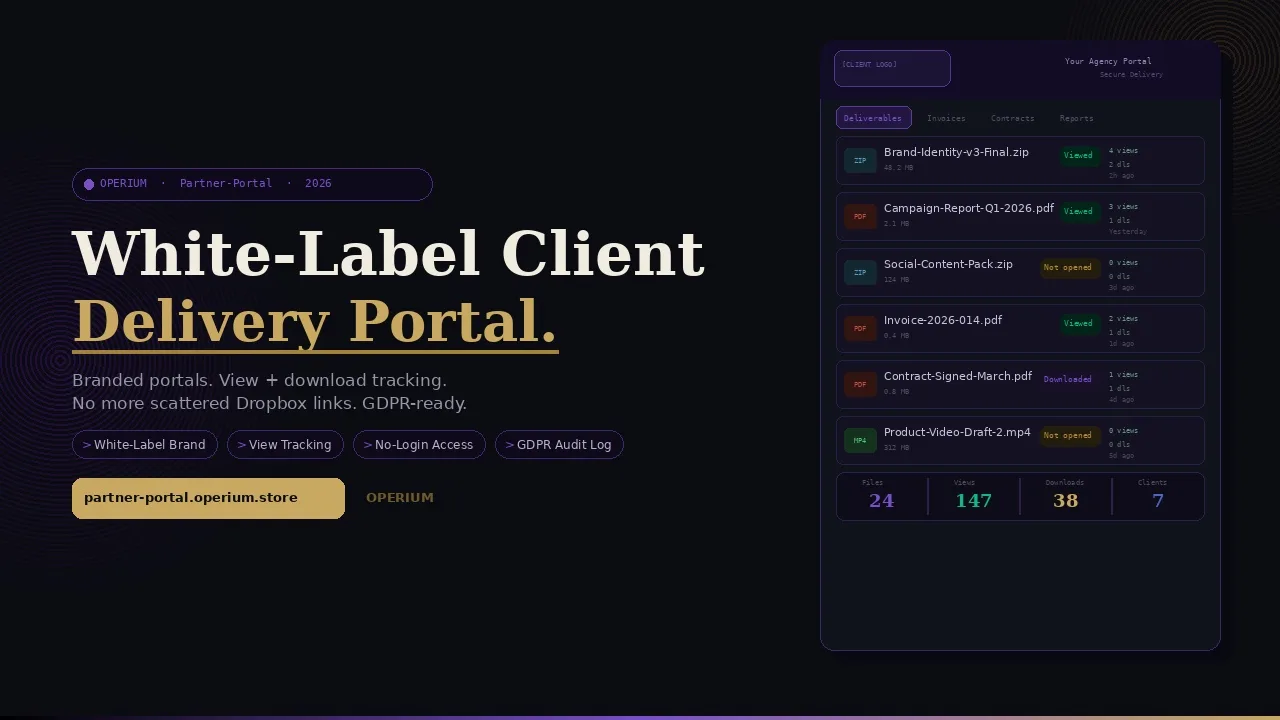 Partner-Portal is the delivery layer of the OPERIUM ecosystem โ where everything your other OPERIUM tools produce is shared with clients in a professional, tracked, branded environment.